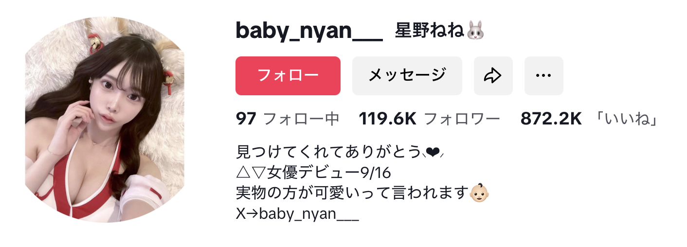 因为怕你不信,所以片商附上了她的Tiktok帐号(https://www.tiktok.com/@baby_nyan___),确实是个接近12万追踪的网红,而且还很贴心地附上了艺名ー没错,她叫做星野ねね(星野宁宁),虽然透过这个艺名你还可以找到她的X和IG,虽然追踪没有TIktok多,不过从上传的自拍照和短影音来看她就是个标准的网红脸,而且,身材还不错呢: