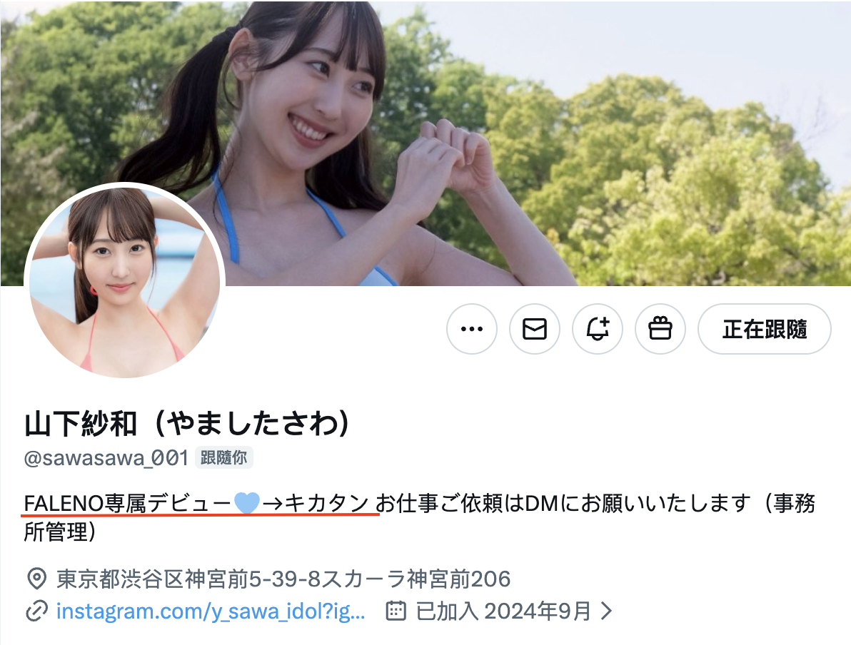 因为山下纱和已经在社群上面说自己现在是以「キカタン(企画単体女优)」的形式发片,也就是说下个月在可爱社发完片后她会继续在其他片商发片ー其实这也是Faleno Star专属女优的命运了,专属契约结束后她们通常很难得到其他片商的青睐继续当专属女优,多半就是像山下纱和一样要游走于各片商找寻发片的机会: