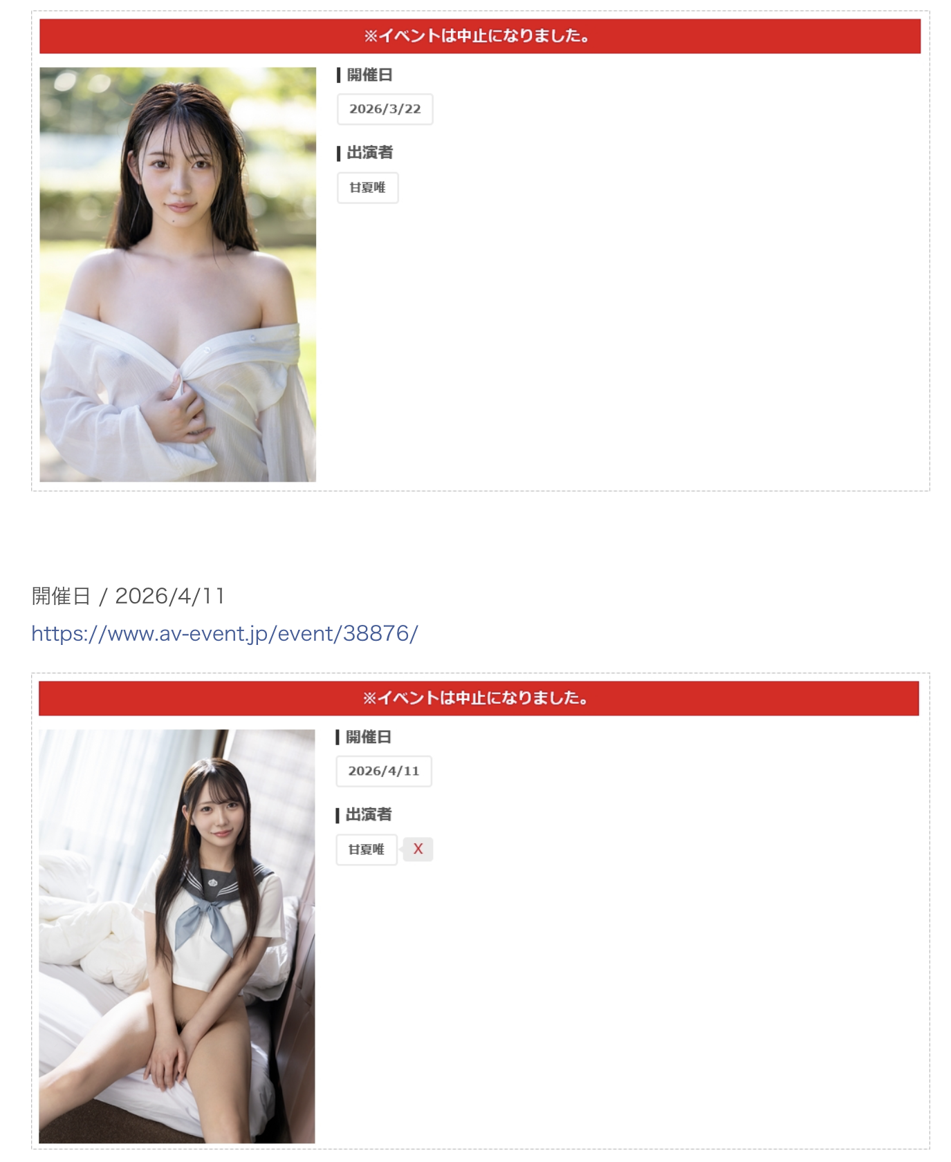 她是怎么了?首先,她最近两场的见面会活动,一场3月22号、一场4月11号都取消了,除非是生了一场大病无法露面,不然就是甘夏唯有不能说的原因让经纪公司无法保证她能出场所以干脆取消活动ー那大多是被家人和男友抓到限制行动或是和经纪公司关系破裂不想合作了;再来,另一个判断女优状况的指标「社群」,甘夏唯也出状况了,她的X在2月3号之后就没有更新,虽然之后又注册了一个新的帐号,但到现在都没有发文,所以ー