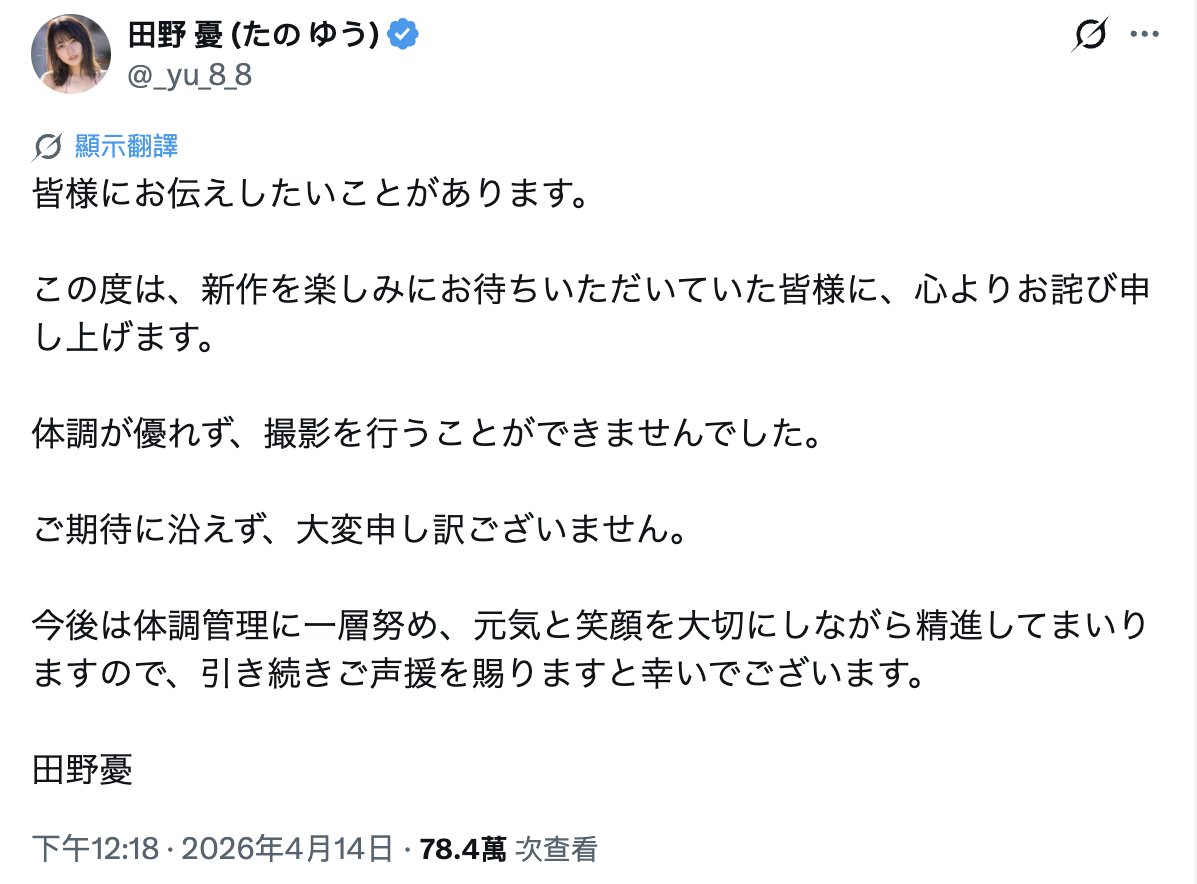 虽然以更新社群的状况来看应该不用担心,不过像她这样的专属女优,跳过发片应该要有个说法,所以田野忧发文解释了: