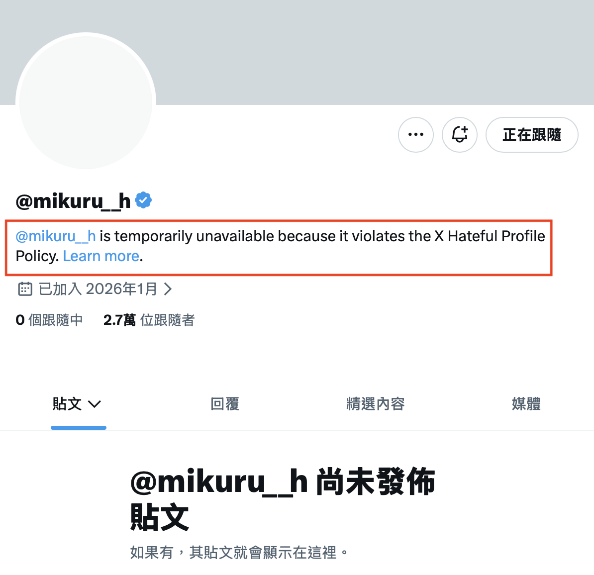 这个帐号的主人是片商S1的专属女优、有灵长类最狂Body之称的「雏形みくる(雏形美久琉)」,从1月情报解禁到现在,这个帐号已经累积了2.7万的追踪,不过就因为触犯了X的仇恨言论守则,这个帐号虽然还看得到,但雏形みくる(雏形美久琉)完全无法更新: