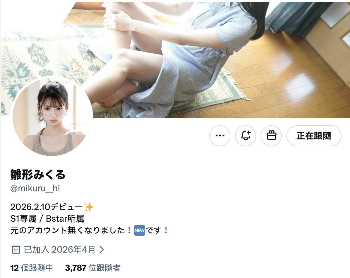 因为是片商S1的重点新人,所以我一直很关注她的发文,其实她写的东西蛮正常的,但X前阵子的帐号冻结祭实在太夸张,很多人的帐号莫名其妙被封而且怎么申诉都救不回来,雏形みくる(雏形美久琉)这个主帐也在这一波封号潮中阵亡,只剩下小号: